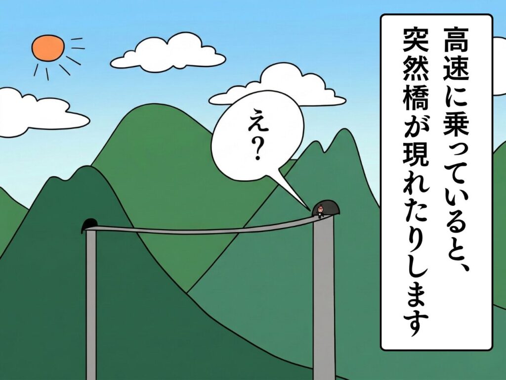少し慣れてきたので引き続き走っていると、突然高い橋が。