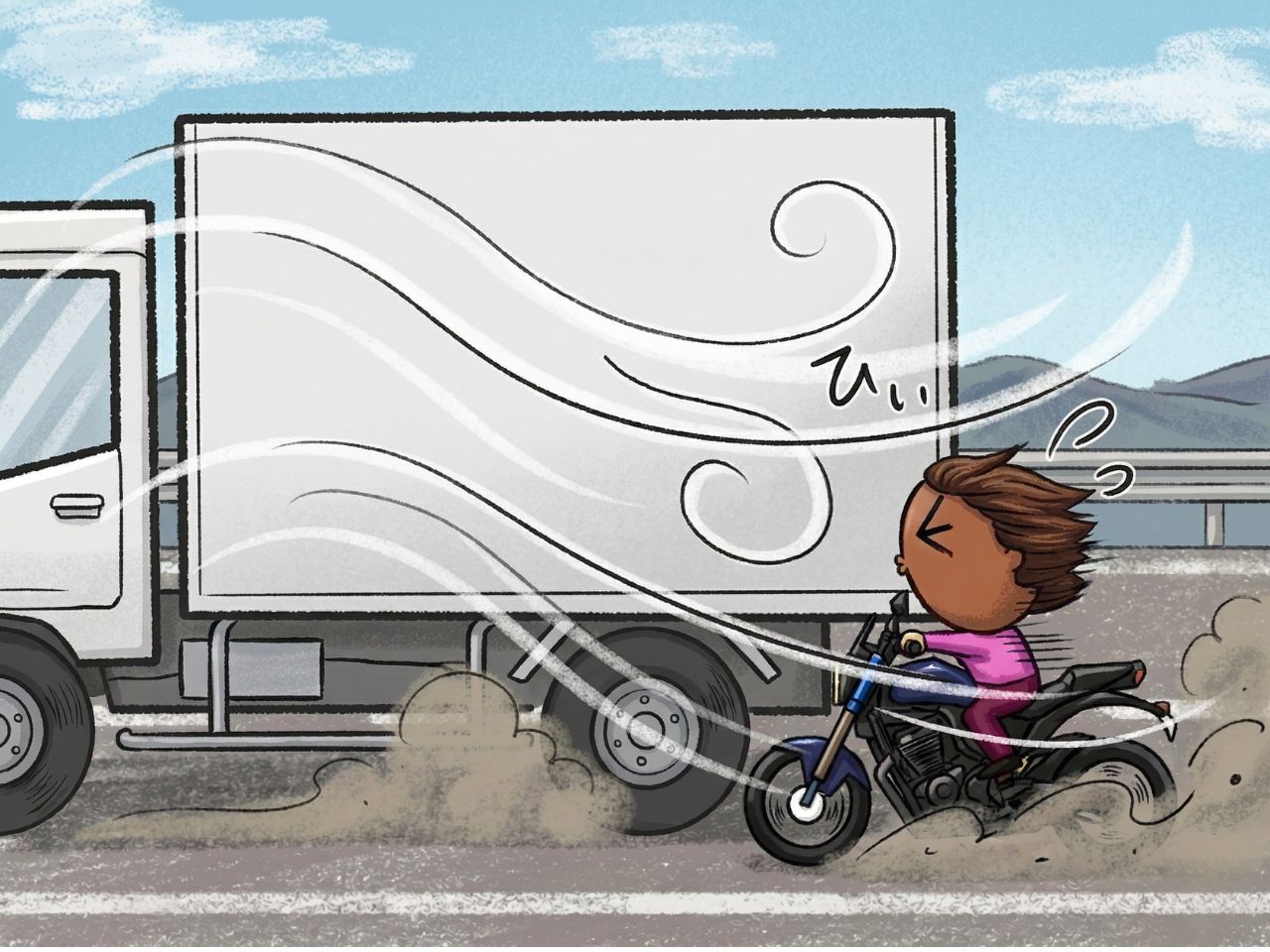 トラックに追い越されると、毎回強風が発生して、その度に転倒しそうになります。