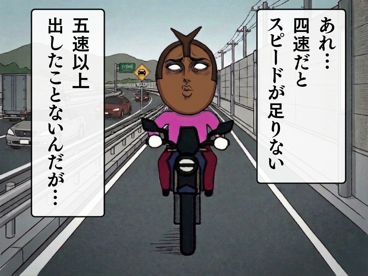 一般道で言うと、(法定速度を守っている)原付の気分