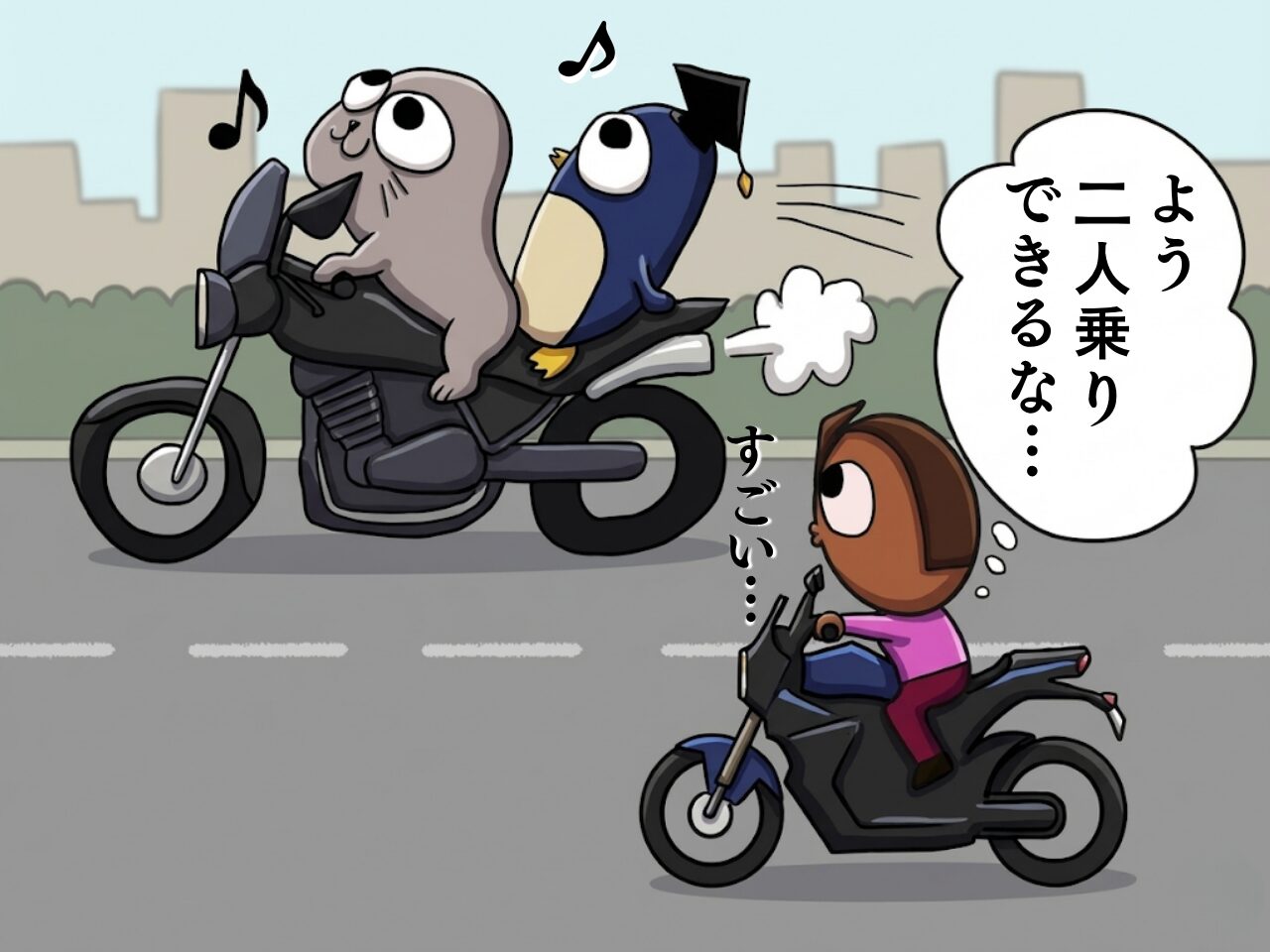 「高速では二人乗りとか無理やろ」と思っているのですが、意外と二人乗りも高速走っていましたね(すごい)