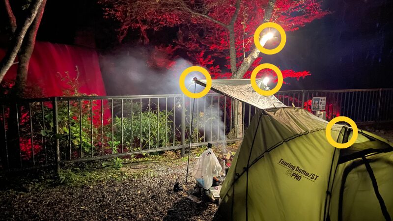 キャンプは暖色ライトを使うと映えます。一方、白色すぎると人工っぽさが強くなるので、キャンプ感が薄れます。